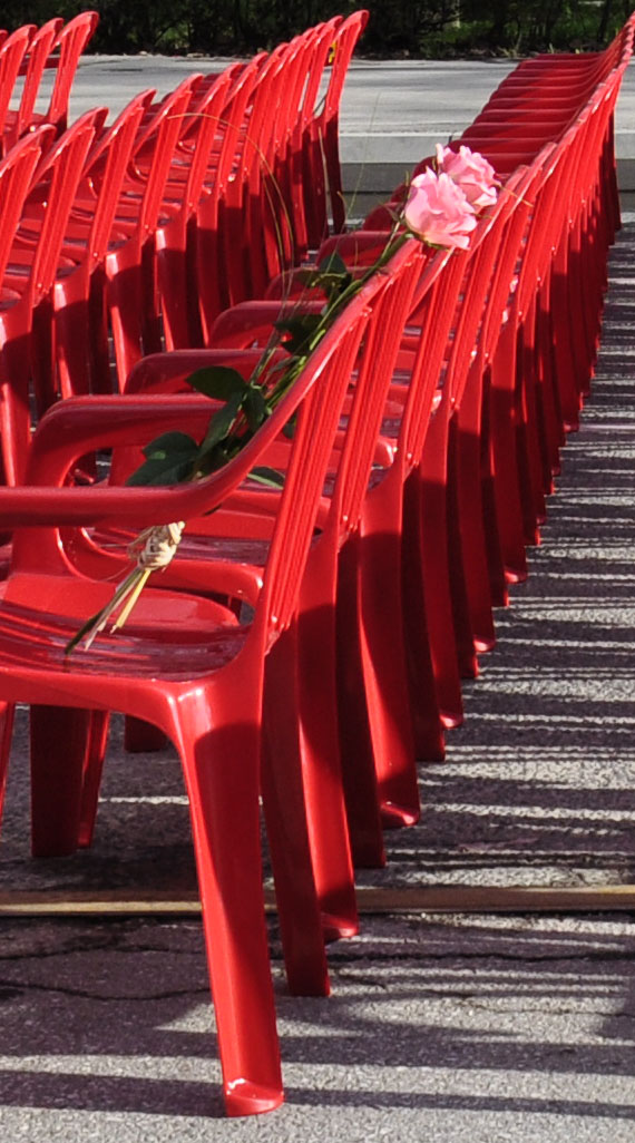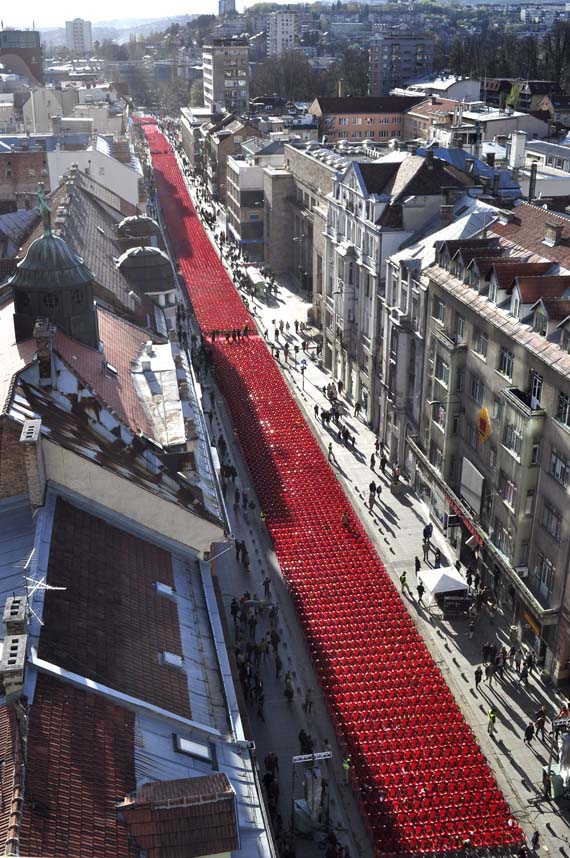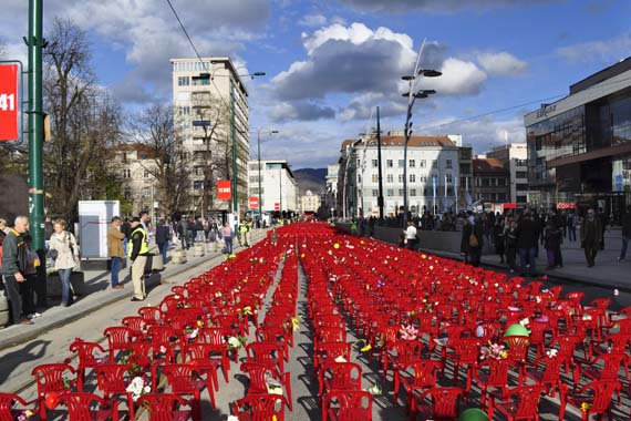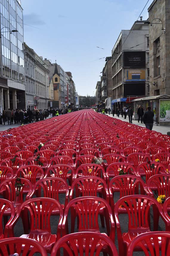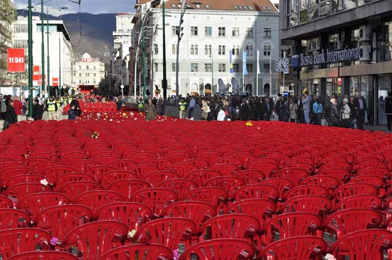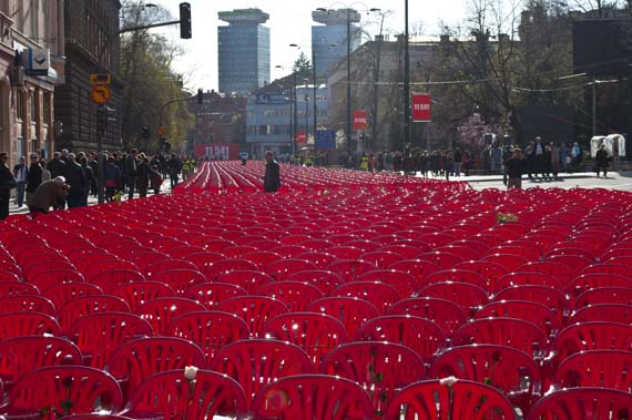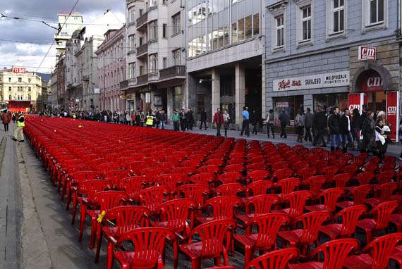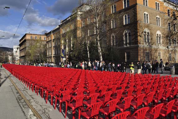 In order to introduce the size and scope of the tragedy, 11541 empty chairs were set in Sarajevo's main street to marks every killed civilian during the Sarajevo siege, between 1992 until 1996. The performance was conceived as a concert to which all killed citizen were invited and who unfortunately couldn't come.