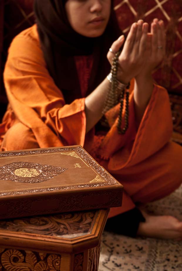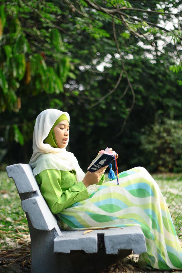 Description: A woman reads the holy Quran while waiting for sunset in a garden.