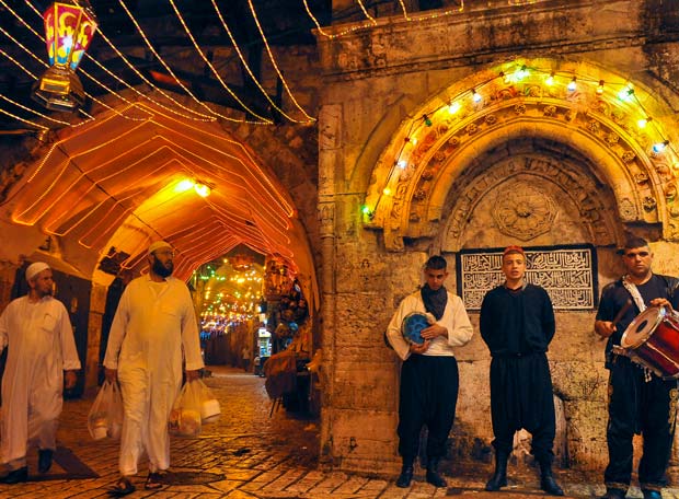 Description: Young Mossharti (The waker-upper) keep the old tradition of Jerusalem to wake up Muslims for suhour before the sun rises.