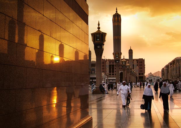 Description: A shot from Masjid Nabawi in Madinah at sunset, the time to break fast and pray the 4th prayer of the day.