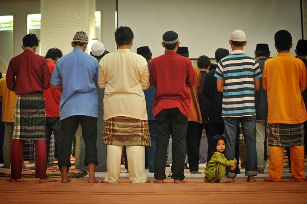 Description: A young girl grabs hold of her father's leg during tarawih prayers at Tuanku Mizan Mosque at the Universiti Teknologi in Mara.