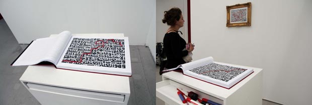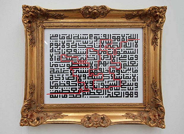 The exhibition will focus particularly on the series "To Go Astray", which consists of three parts. People unfamiliar with Arabic would experience the central motif found throughout mainly as a labyrinth through which a path with a red pen has been drawn. However, the art work found in the golden frame, in the red book and in the simple framed single-sheets, is actually an excerpt from the Qur'an (Sura Alâ€Baqarah) written with the computer script Al-Kufi. On one hand, Wamidh Alâ€Ameri wants the viewer to find, in a playful way, his own path through the Qur'an, but at the same time to take away the fear from the western viewer, and allow him or her to break down the stereotypes regarding "Muslims" and "Islam" and to get in touch with this meaningful text. The path is drawn, it is important to note, for both Muslims and non-Muslims, which gives the series "To Go Astray" a general and universal character.