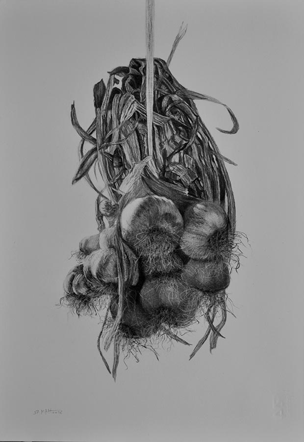 Hungry for Home is a collection of 18 compelling hyperrealist pencil and charcoal drawings that use traditional Palestinian food as a platform from which to explore deep-rooted cultural codes and memories. The act of eating is a powerful and intimate practice, the textures and flavours we encounter are absorbed into not only the body but also the memory. Food is something that we unite over and which can draw companionship into our lives. Shihadi’s powerfully realistic drawings, more closely aligned with photographs, use Palestine’s dishes and communal eating practices to communicate the collective experience of lost identity, displacement, and ultimately the artist’s aspiration to return home. “For the Palestinians living in the diaspora the table is an anchor point,†says Ranya Tabari Idliby, Palestinian author, based in New York, whose excerpts of writings on the same subject are displayed alongside the artworks. “It’s where families gather, and community is built. It’s where memories of a Palestine lost are shared and where a threatened Palestinian culture lives and thrives.â€