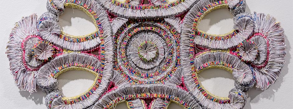 Jaynie Crimmins creates objects with meticulous handmade details that contrast with the banality of their materials. She repurposes solicitations, safety envelopes, and catalogues that are difficult to recycle (because their inks have high concentrations of heavy metals). Shredding these marketing materials breaks down their physical structure, so the artist can roll, fold, sew and fabricate the shreds into intimate sculptural reliefs. These pieces are then assembled into sculptural 3D artworks.