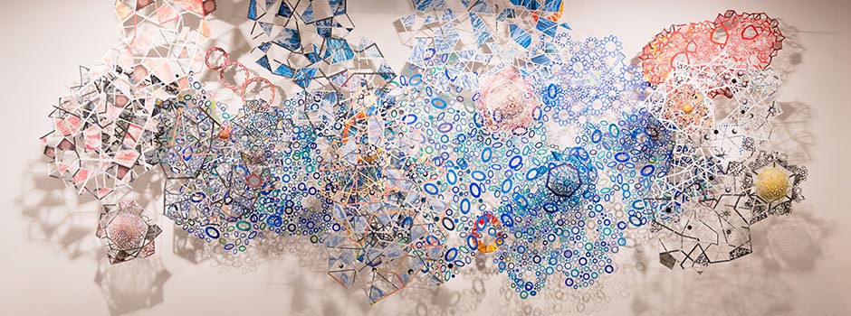 Nancy Baker finds her solace in the geometry of fundamentals. She focuses on the ephemeral nature of paper and the ease of its transportability, which allows her to create large scale constructions. Her large installations are multilayered, and can significantly project outwards. She uses special mounting custom made brackets that visually disappear, and all one can see are floating paper compositions. Baker searches he inspiration in ocean and sky, and her installations seem to be floating in the space. She also includes words and phrases but seeks to partly obscure the written content, by painting and slicing into the letters, integrating them into the overall structure of the piece. The paper artworks combine digitally printed, hand and laser-cut geometric shapes that are painted, sprayed, scraped and gouged. She uses glitter, paint, modelling paste, gold leaf, printed commercial matter, and recycled paper pulp forms.