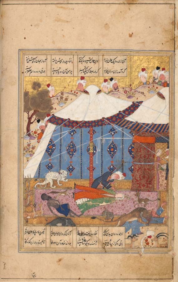 After being forbidden to marry his beloved Layla, Majnun retreats to the wilderness, where he has only wild animals for company. Attempts to arrange a rendezvous between the pair are generally unsuccessful because Majnun faints at the sight of Layla. In the episode shown here, both faint in each other’s presence.
