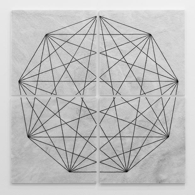 Extending from these new Misprints are three Construction Drawings, a series of marble inlay works that repeat the process of rotating triangle, square and hexagon. That creates a complex circular web of straight lines. These works are meticulously hand-crafted from two contrasting colours of stone – white marble and black granite. Unlike the Incomplete Open Cube forms which are finite, these spinning lines are expansive and boundless. They have a mystical quality, recalling the geometric drawings of Emma Kunz or ancient mandalas.
