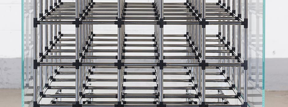 Mahmoud Obaidi, The Invisible Sphere Around the Cube, 2013. Stainless steel and glass, 150 x 50 x 50 cm. Edition of 3