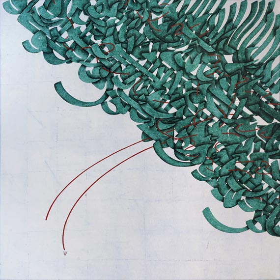 Aghighi Bakhshayeshi / Traces 8,150x150cm, oil and silver lea on canvas, 2012 / Courtesy of Galerie Kashya Hildebrand