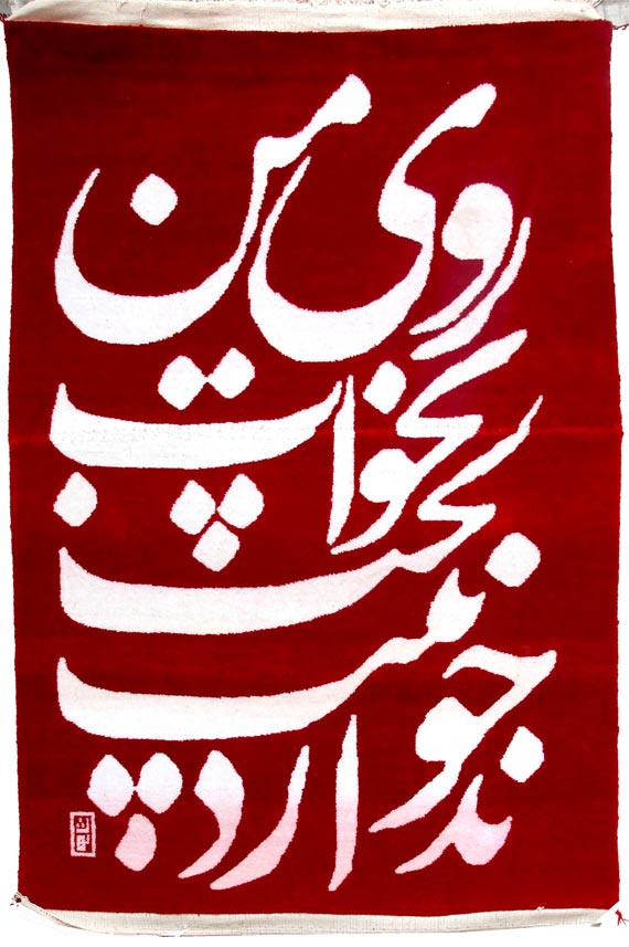 Though fully trained as a calligrapher, Abolfazi Shai has turned to creating carpets that make playful and ironic statements about Iranian culture. Literature, calligraphy, and carpet making have long been a vibrant part of Persian heritage, and while words are ever present in Persian culture – texts rendered in beautiful calligraphy adorn the mosques and public spaces – it is not common to find them on carpets, as it would be disrespectful for texts to be walked upon. Indeed, it is the intention of the artist for these carpets not to be walked on. Shai, however, uses these carpets as a showcase for texts from popular songs that the women weavers sing while working making a playful statement about popular songs and modern life.
