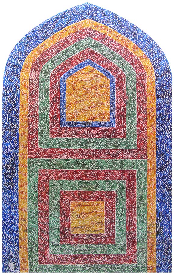 Based in Tabrinz, Zindashti is influenced by an architectural principle that draws a correlation between architecture and ethics. He believes that his works function as alternative spaces for prayer, repeating the text of the Prayers for Prosperity in abstracted and improvisational Seljukain and Talisman scripts. His works express humbleness and spiritual devotion, but they also attempt to revive a forgotten art ethics, where repetitions of texts become prayers in their own right. Unlike traditional calligraphy that illustrates specific Koranic texts or poetry, Zindashti creates spiritual works with no direct references.