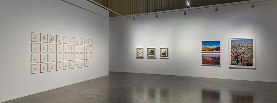 Installation view of Unseen: Summer Group Exhibition, from left to right: Shahpour Pouyan’s Memory Drawings (2015-16), Farhad Ahrarnia’s The Inquisitive Man’s Dream, At One O’clock in the Morning and Invitation to the Voyage (2015-16) and YazanKhalili’s Area A (2010), Area C/1 (2010) and Colour Correction 2 (2007-10) / Courtesy of Lawrie Shabibi and the Artists.