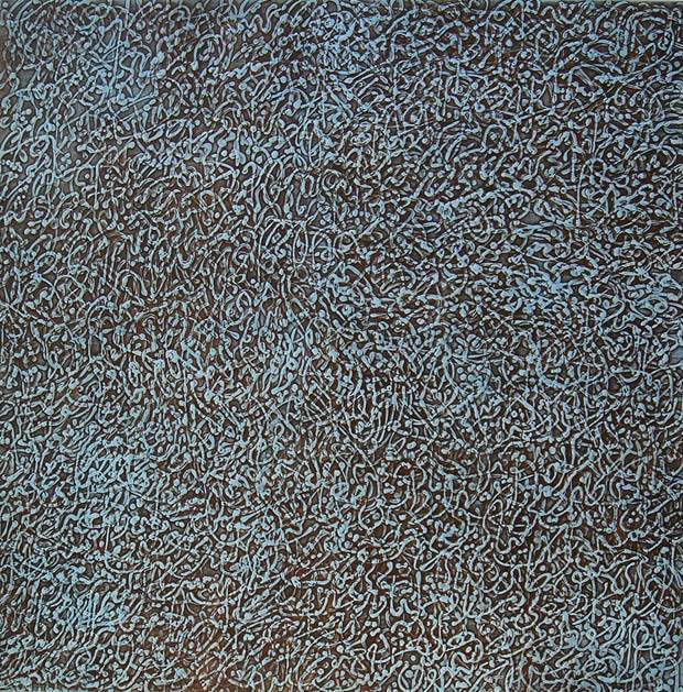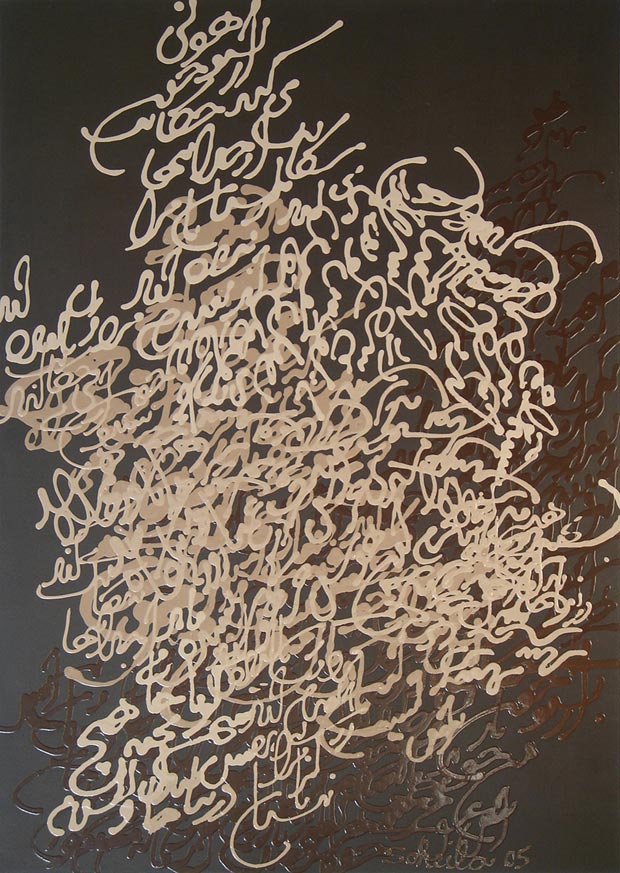 In my paintings, the specific Rumi poems that serve as inspiration and starting point are obviously related to my personal state of mind at a given moment or period of life. For example, in my first series "Poetic Compositions", I was drawn to the verse "Lovers, oh, lovers, I shall turn your dust into gold," since I felt connected to the idea of transformation into something higher. As an artist we use materials and substances, but try to transform them into concepts and meanings, which is ‘gold’. At the time of the "Reed Flute" series, I was feeling disconnected to my Persian roots because of living in Canada. So the work speaks of trying to go back and find your source. My most recent piece, Made in Iran, is a series of artifacts that involve various designs that I have a personal connection to. The designs include graffiti from the garbage bin by the bus stop in London where I would take the bus back home to Waterloo during my MFA studies at the University of Western Ontario, a William Morris wall paper design appropriated from a greeting card my brother sent me for the Persian new year, an 'Amir Lebanese fast food' logo that my friends brought back from their trip to Montreal, and so on. So, you see, the two, art and life, are in my case very related to each other.