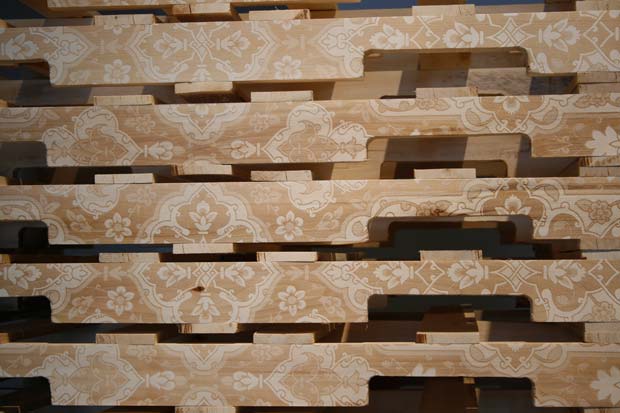 Soheila Esfahani / Detail, “The Vagireh Patternâ€, Laser-etched wooden shipping pallets, 62â€x48â€x40â€, 2010 / Courtesy of the artist