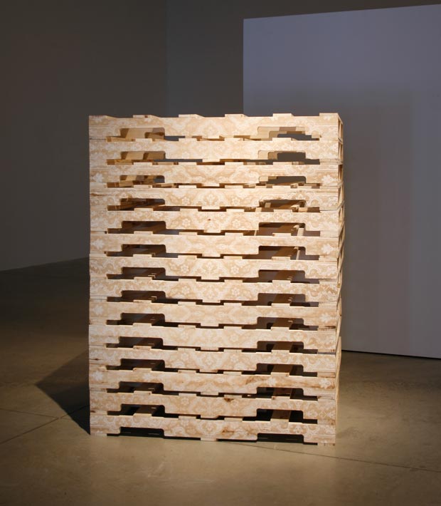 Soheila Esfahani / “The Vagireh Patternâ€, Laser-etched wooden shipping pallets, 62â€x48â€x40â€, 2010 / Courtesy of the artist